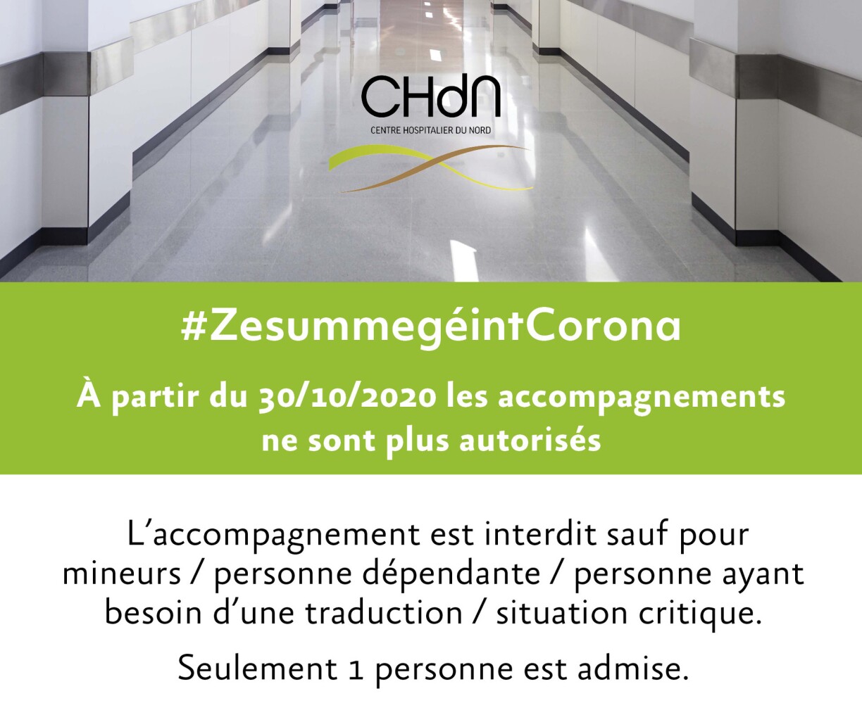 The three sites in Esch, Niederkorn and Dudelange have exceptions in place for patients in the “green zone” (non-Covid): underage patients can have both parents present, mothers can have their partners present when delivering, and the maternity ward allows a one hour visit by the partner. Furthermore, visits for patients in a critical health phase or at end of life can also be approved by the attending physician.