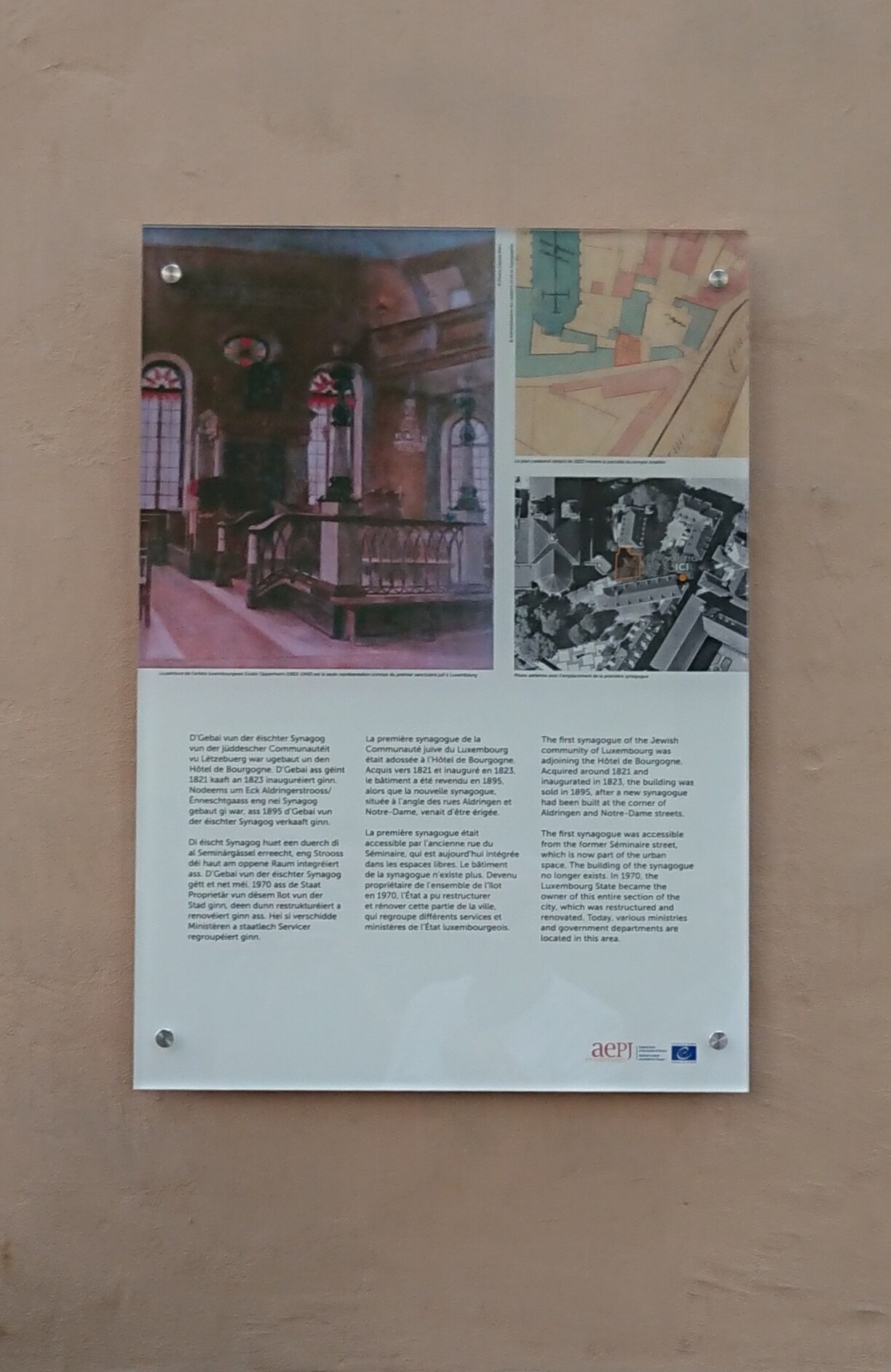 The location for the commemorative sign was chosen in accordance with the first Luxembourgish synagogue, which was built in Rue de la Congrégation in 1823.