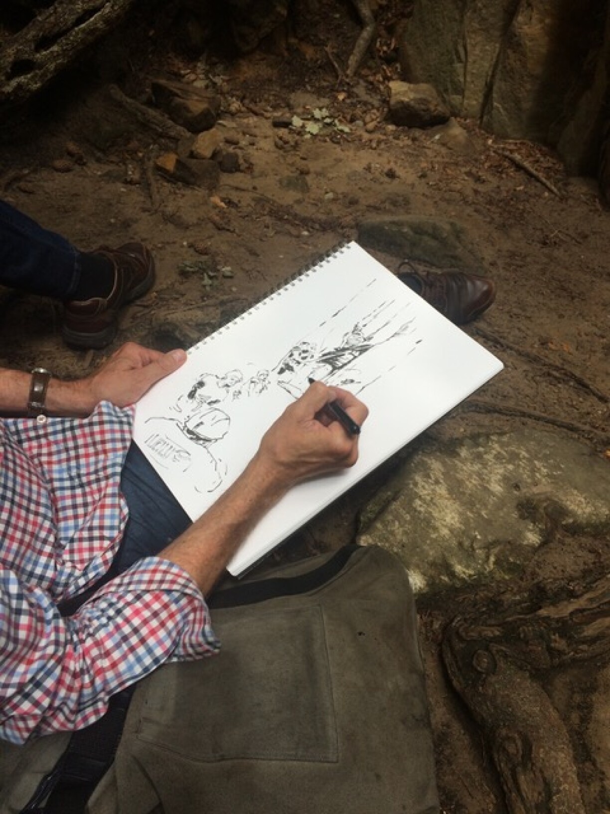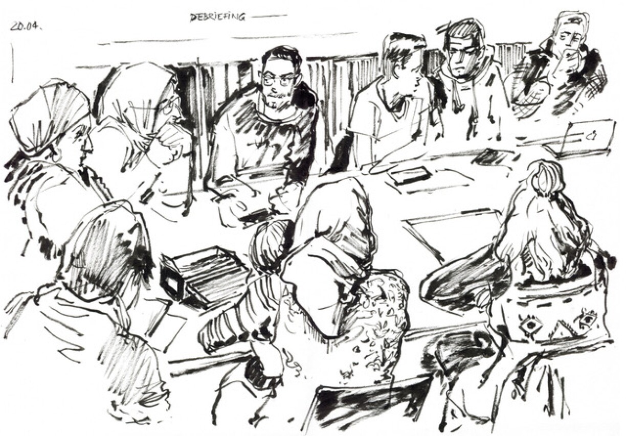 “Listen to what is being said, identify or choose the focus of the action. Many things happen at the same time. Drawing is a slow action, even if you are very fast. So you make choices. The most important could be the unimportant things. I try not to think and let my drawing flow, not even instinctively, just let it be done by me. Sometimes the difficulty is to make it easy. Breathe and be there, here and now.