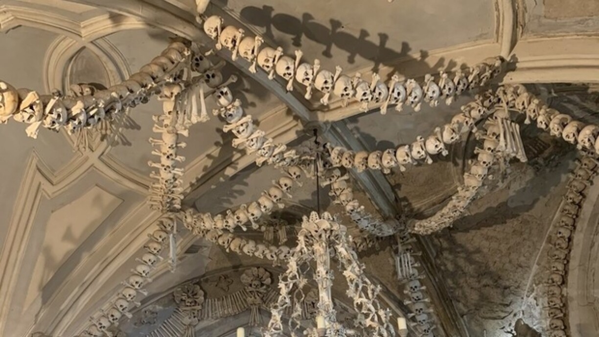 The Sedlec Ossuary stands out as a particularly well-known chapel in which thousands of bone adorned skulls hang.