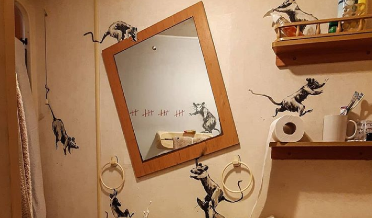 “My wife hates it when I work from home” reads the caption on Bansky’s official Instagram.