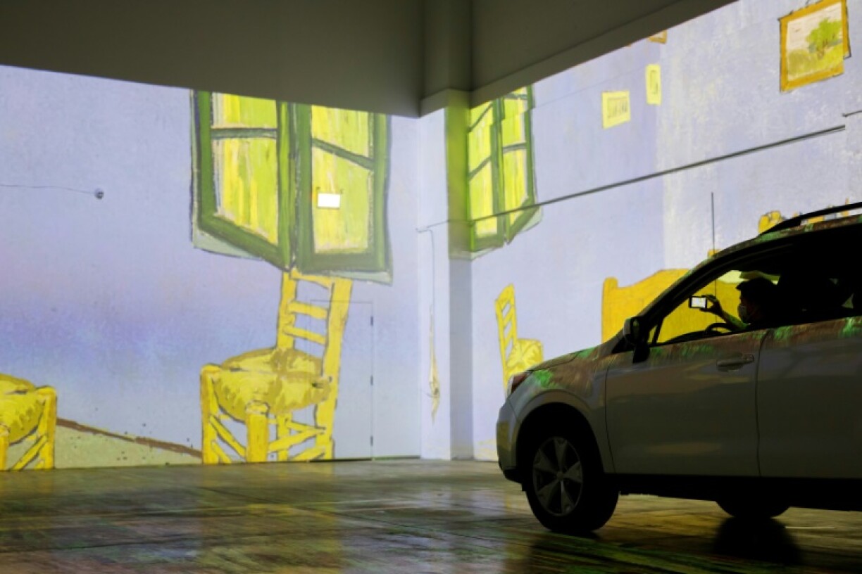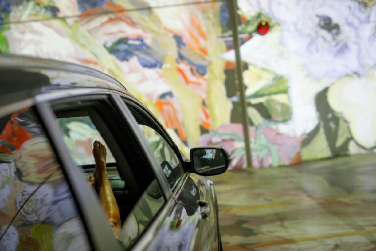 The exhibit spans two separate galleries, one for pedestrians that includes social distancing floor markings, and one for motorists.