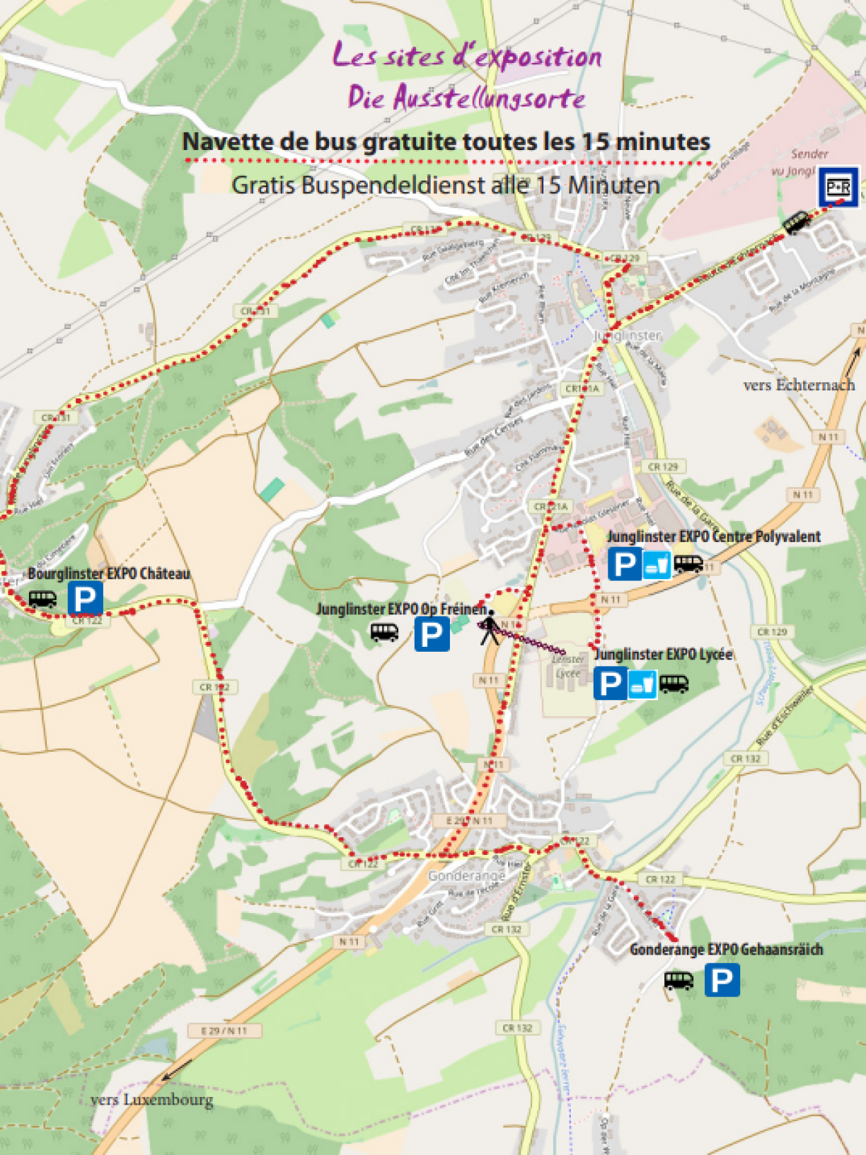 To get from one exhibition to the next, a shuttle service has been arranged which will take you from the P&R Junglinster to the individual venues.