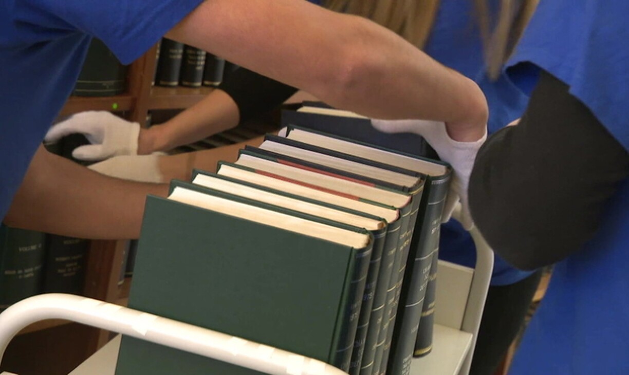 The book cleaning process is meticulous - workers must remove books by the shelf and dust both the shelf and the books, only to return them back to the shelf. Come March, the books will be packed up and moved to their new home.