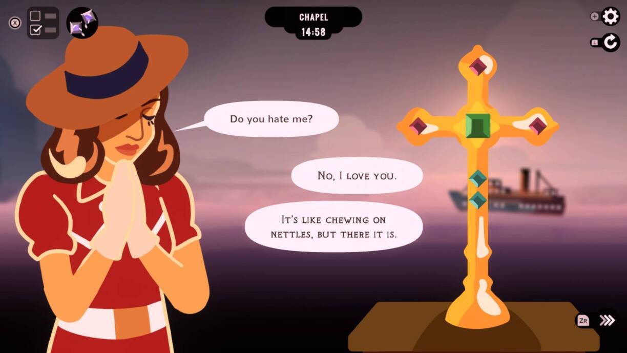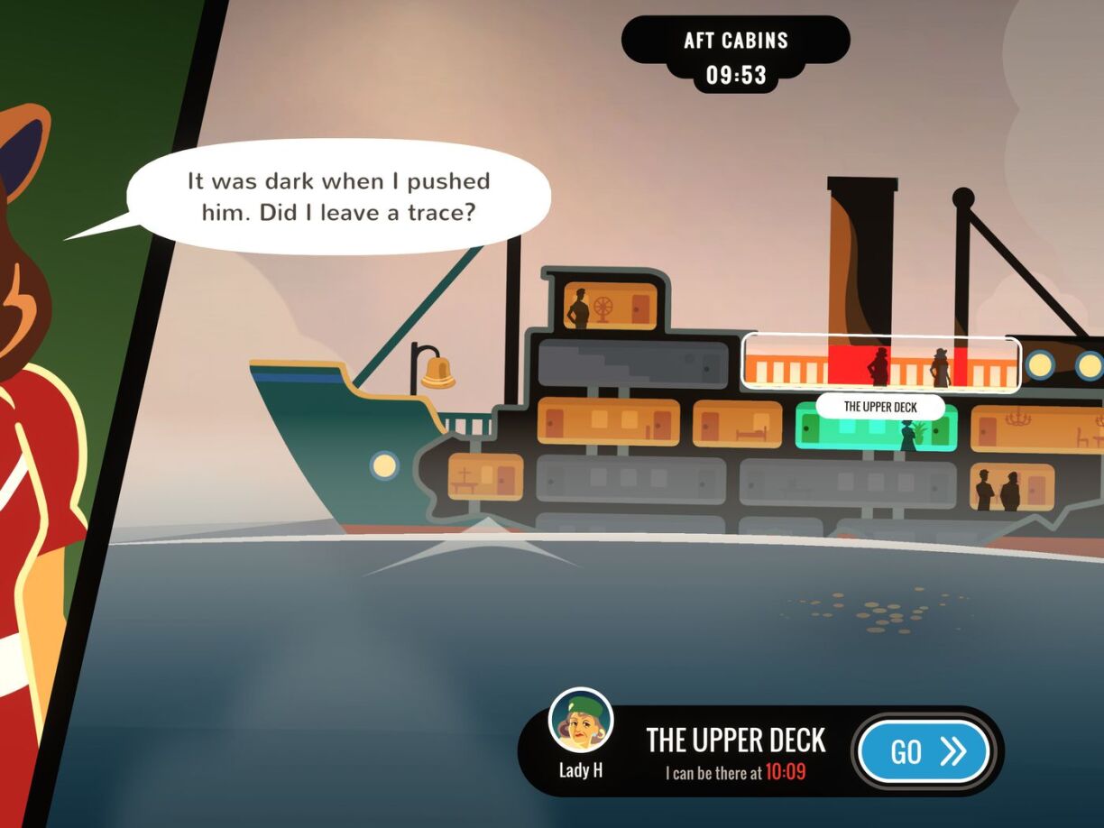 You play as ambitious starlet Veronica Villensey, who as it happens, has just shoved husband over the side a luxury transatlantic ship. Your aim thereafter is to not get arrested for murder.
