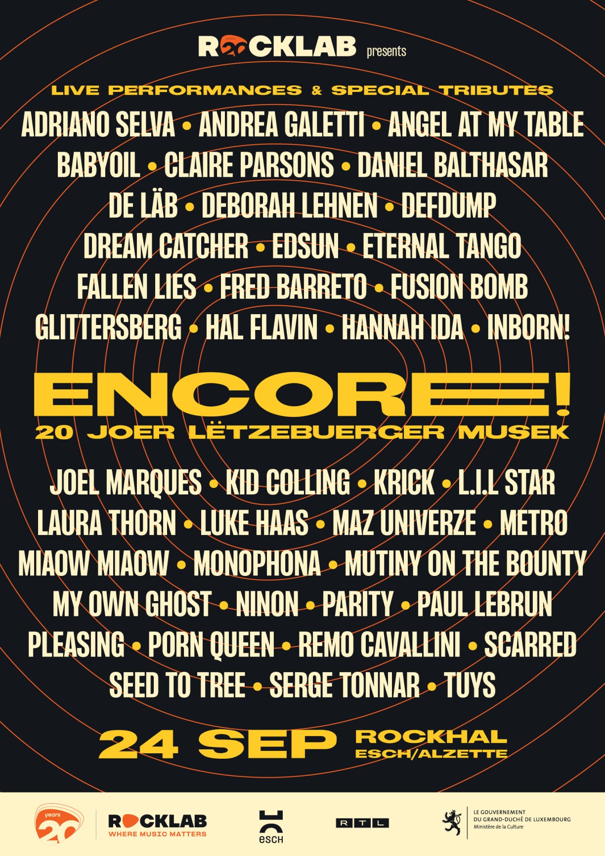 A rich and diverse program, with outstanding individual performances, unexpected duets, specially adapted covers, and exclusive collaborations between more than 30 artists from different generations will mark a historic evening for Rockhal’s ongoing journey. The acts will be joined by an original house band made of eighteen musicians from the local scene, who will perform some twenty well-know and much loved titles that have left their mark on our history.