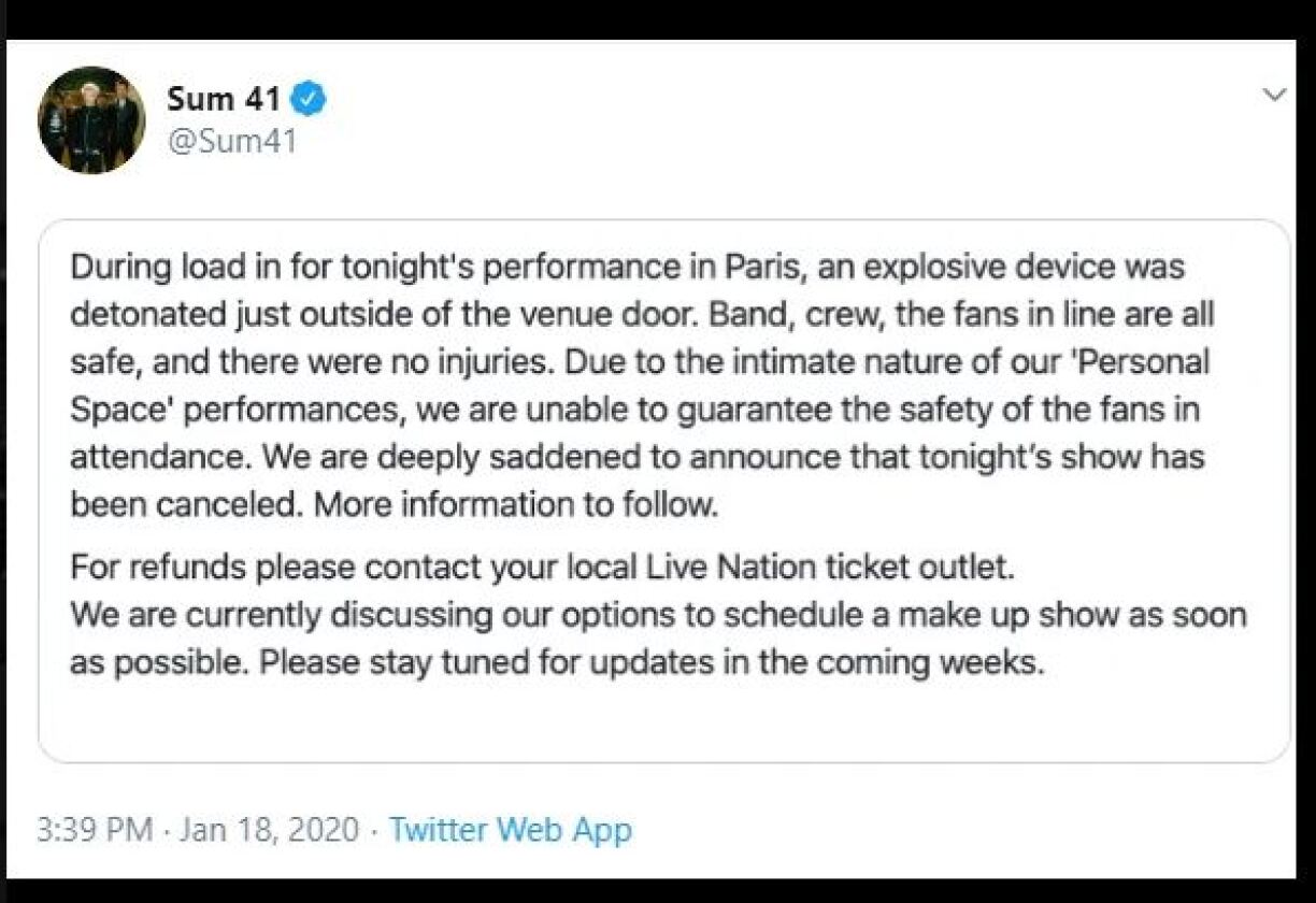 Sum 41 have cancelled two shows in the French capital following the detonation of an explosive device outside one of the venues they were due to perform in.