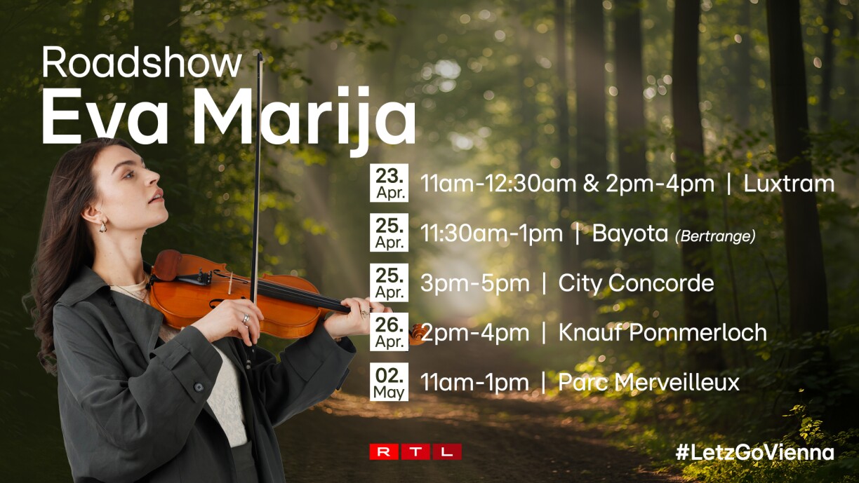 The tour kicks off on April 23, with a first show in Luxembourg City, where Eva will perform twice aboard the tram between Luxexpo and Bonnevoie – once in the morning and again in the afternoon. Just two days later, on April 25, she will continue to Bertrange for a stop at Bayota, followed by another appearance later that same day at City Concorde. On April 26, the roadshow moves on to Knauf Pommerloch, before concluding on May 2 at Parc Merveilleux.