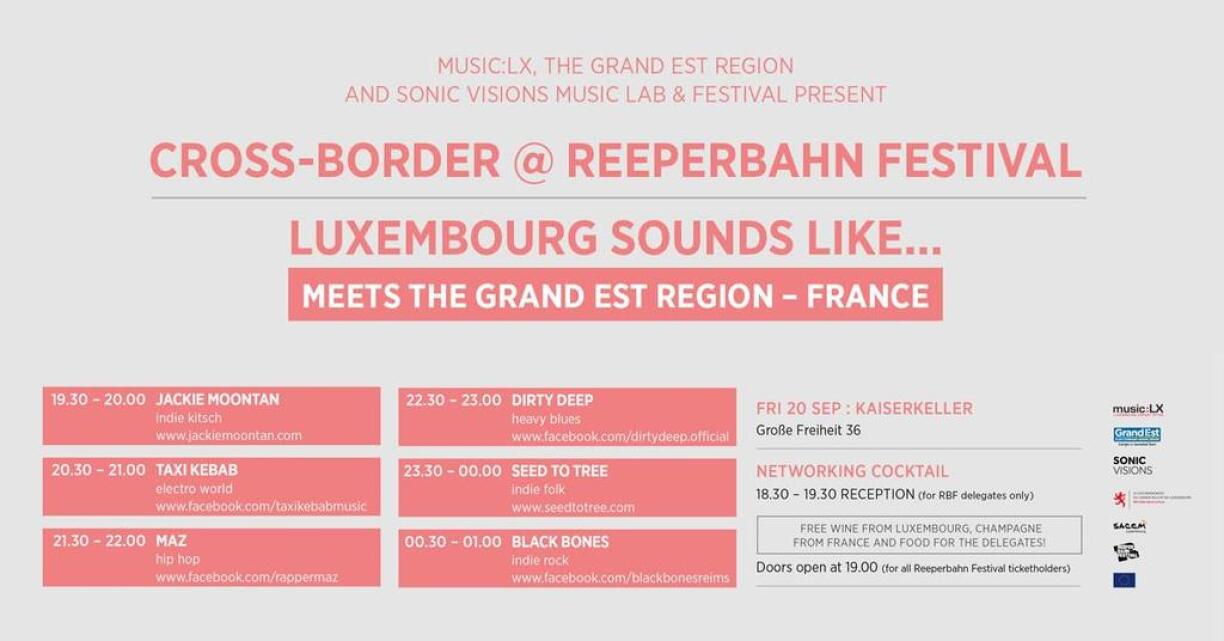 They are joining forces not only music-wise, but food-wise too. The Cross-border @ Reeperbahn Festival event will offer finger food, sparkling drinks from Grand Est and wine from Luxembourg. The rest of the evening is filled with an outstanding line-up of artists including Seed to Tree and Maz.