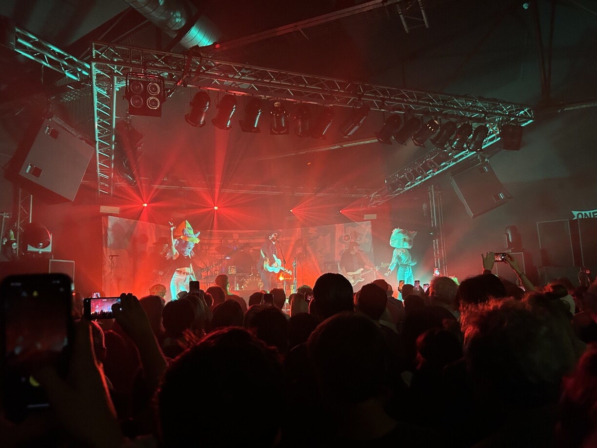 Behind the musicians, doodles, cartoons, and psychedelic patterns were projected, making the most of the small set. Then the musicians were joined on stage by dancers wearing big cat suit heads. The cat heads were also reminiscent of old school cartoons like Scooby Doo, or perhaps more accurately, the jazzy alley cats from the old Disney movie, The Aristocats.