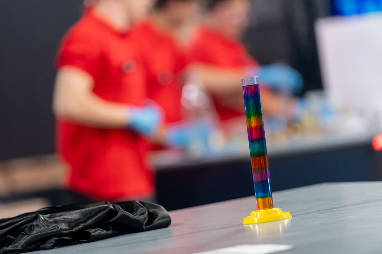 We all know that we eat and drink with our eyes, too. Behind every beautiful cocktail lies a lot of very precise work. The teams must prepare a so-called “density cocktail” – a cocktail made up of seven different layers with different densities and colours. For this, they have glasses, wooden sticks, a special cocktail spoon, sugar, water, beakers, a scale, and of course food colouring. The team that is first to present seven clearly visible layers wins the first challenge.