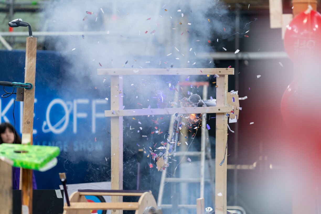 The finalists must build a Rube Goldberg machine, a chain reaction made up of different components. But it’s not just a few dominoes that need to fall one after another. They also have to incorporate electrical elements. The build has to go vertically too, from large to small.