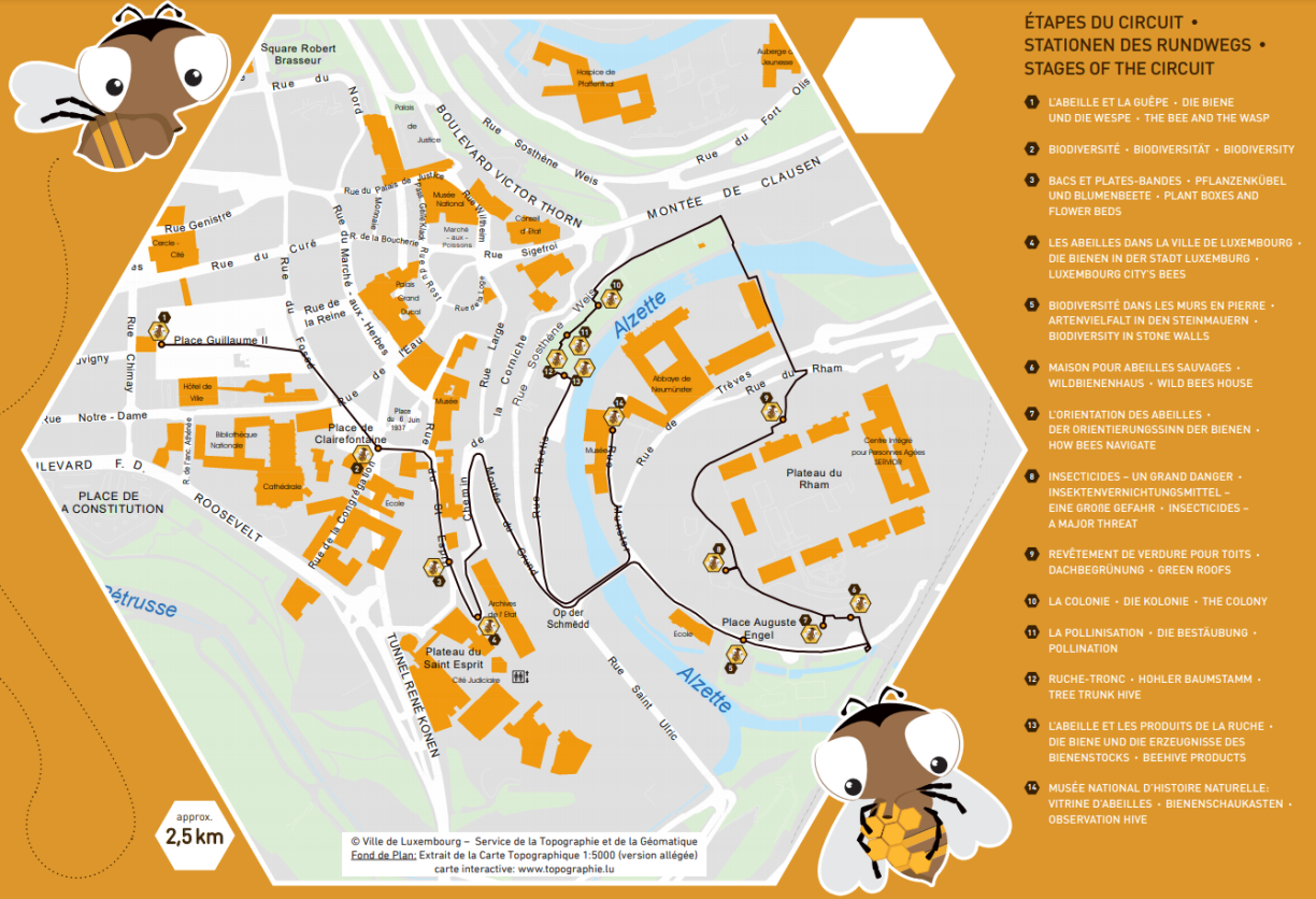 The City of Luxembourg has set up an educational and fun trail through the capital, made up of 14 information points to learn about the world of bees and other insects essential to a healthy and balanced environment. This 2.5 km circuit is free to access and will allow children and adults to discover the richness of biodiversity in the urban environment. Panels alongside the trail are in French, German and English. There are also guided tours available on select days (see link above). Fun bee fact: Did you know a bee produces a teaspoon of honey in her lifetime?