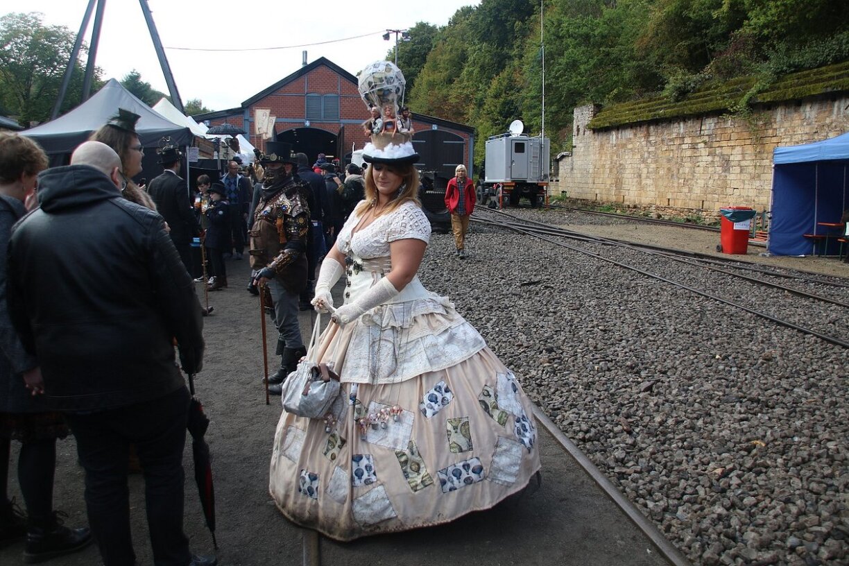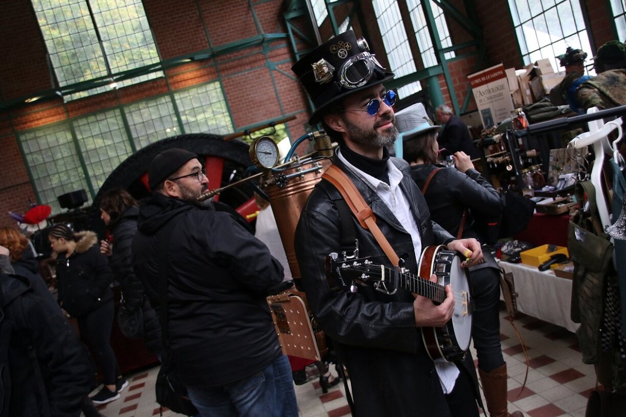 The organizers of the event describe it as “a unique world in which the steam engine and electricity are the sole sources of energy. The aesthetics of this movement, in which the scenery of the show is inspired by the industrial architecture of the late 19th century, is occupied by women in long dresses and men in top hats”.