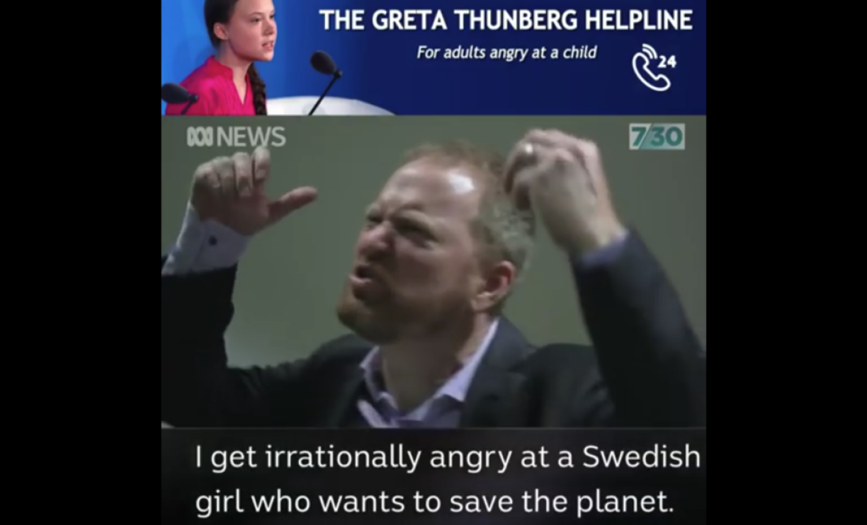 Trump slammed for trolling Greta Thunberg climate speechAustralian comedian Mark Humphries came up with an ingenious solution for the teenager’s outspoken critics: “The Greta Thunberg Helpline” has been launched to help “adults angry at a child.”
