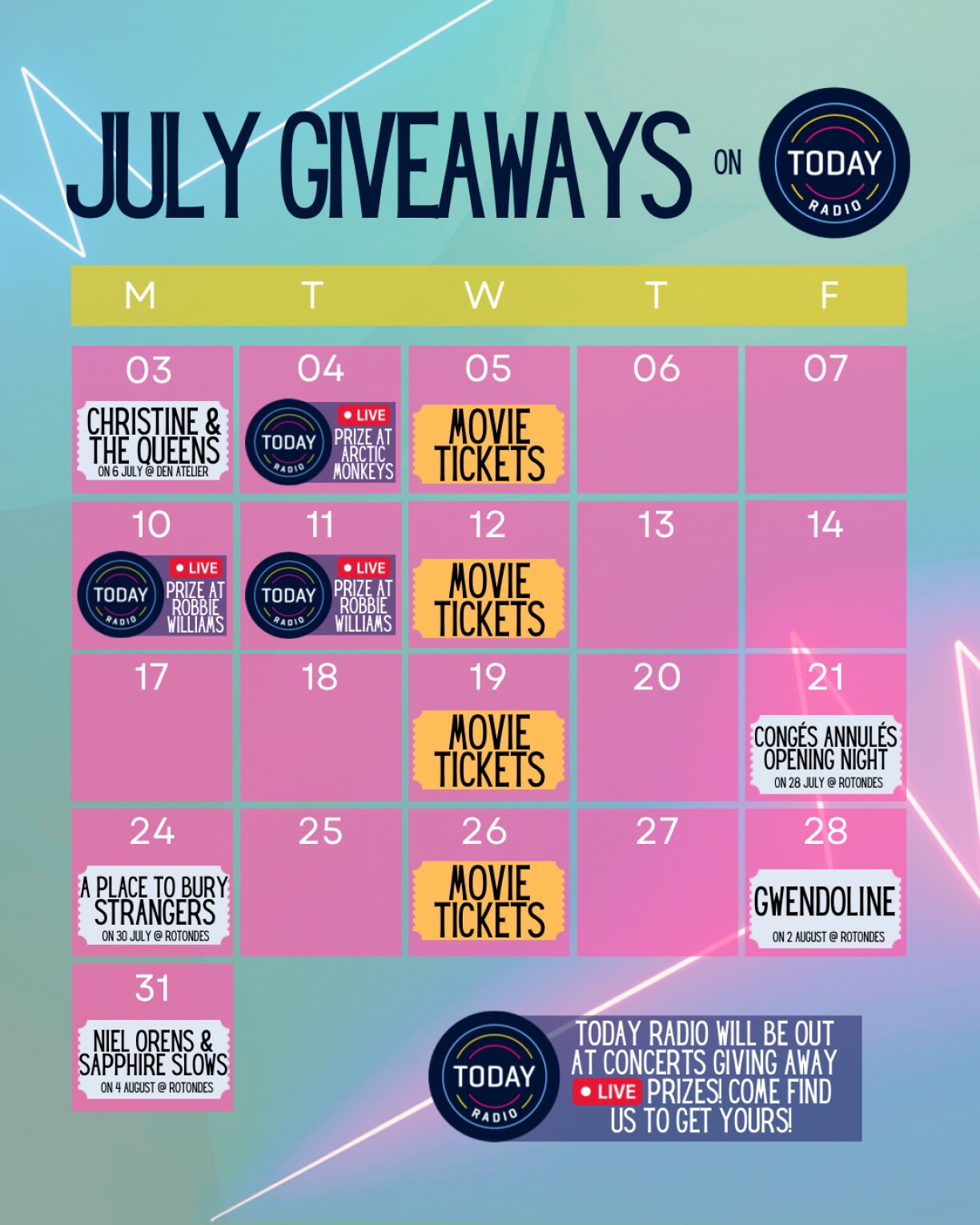 Every month Today Radio offers a myriad of giveaways to the hottest events in town. You won’t want to miss out on performances from Christine & The Queens, A Place to Bury Strangers, Gwendoline, and more! Besides concerts, every Wednesday of July, there will be a movie ticket giveaway.