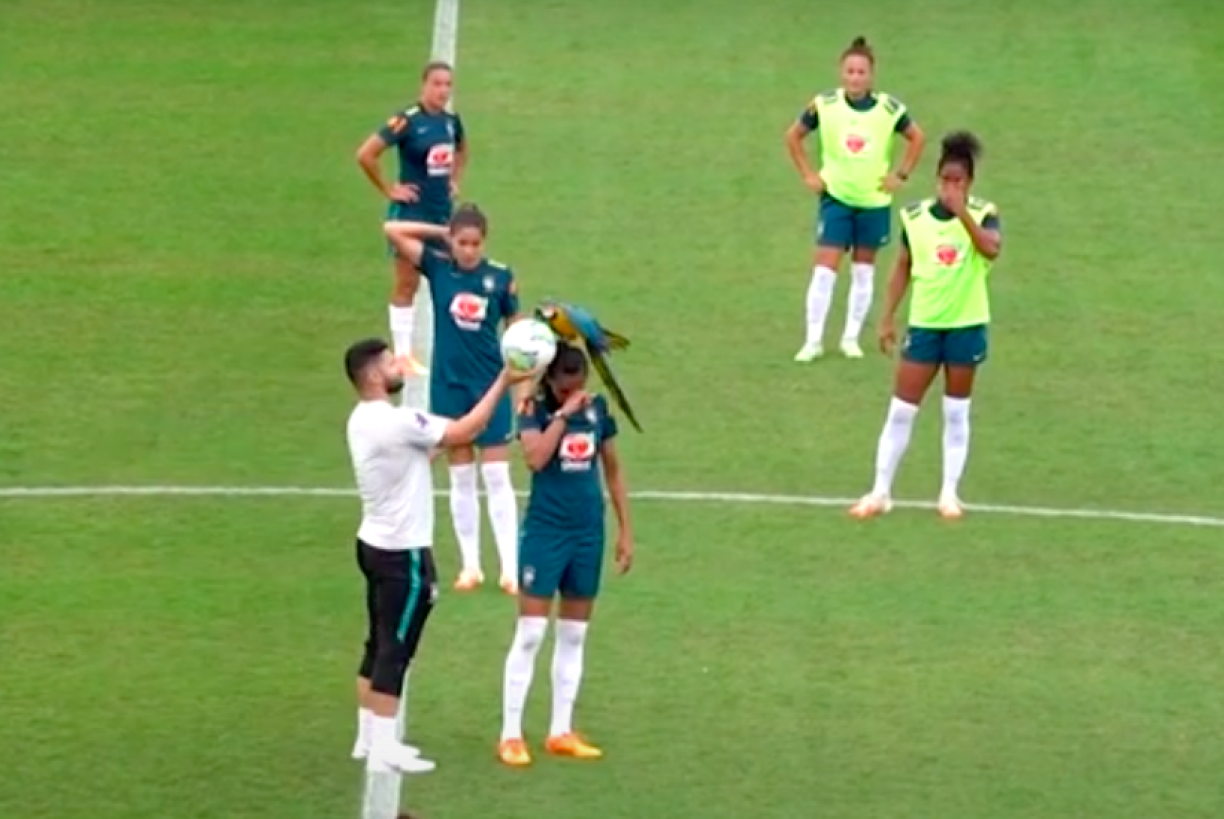 Defender Bruna Benites suffered a shock when a large macaw - a bird species related to parrots - decided to interrupt the training station by sitting on her head.