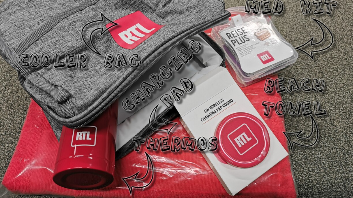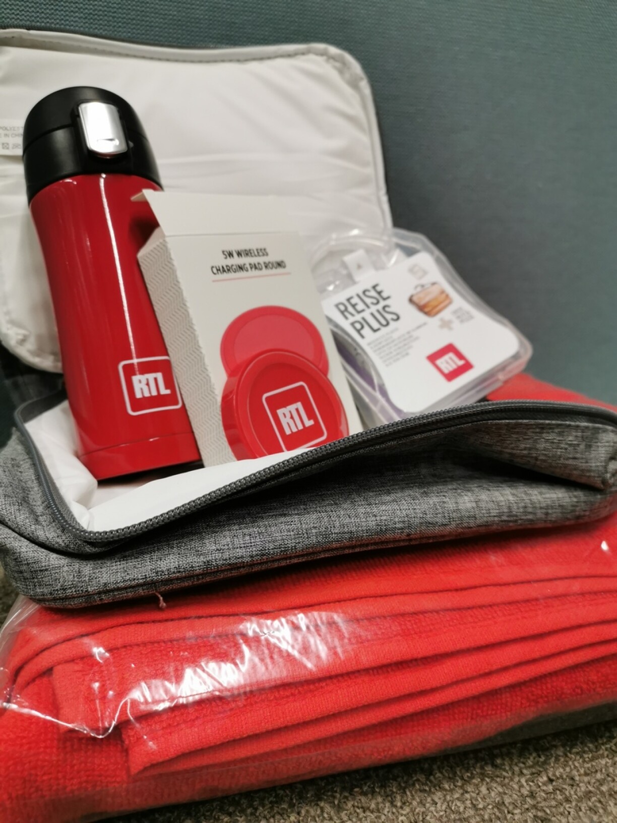 It comes with a wireless charging pod, a drinking flask, a beach towel and a travel first aid kit (better safe than sorry)!