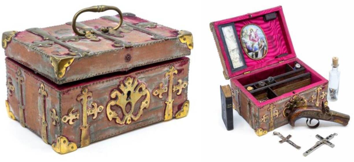 The gothic-style box, which also comprises a pocket-size pistol, a carved ivory wolf in robes and a cobalt blue glass phial with unknown contents - first saw the light of day when its current owner bought it three years ago.