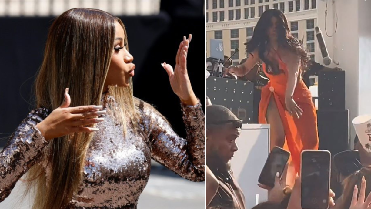 Cardi B, in a bright orange floor-length dress, was singing near the front of a stage in Las Vegas when someone, apparently a woman, threw the contents of a tall plastic cup in her direction.