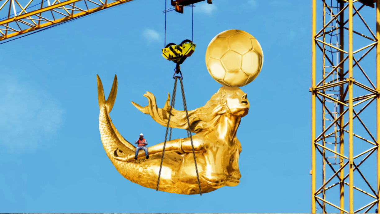 “This golden Melusina is headbutting the ball forward into a bright future of endless wealth and happiness for all the residents of the land,” said Franck Butnum, the artist who created the sculpture and oversaw its delivery on Wednesday.