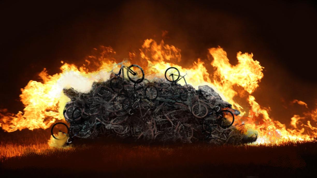 During the Vëlobrennen, riders from all around the country stack as many as 1000 bicycles before setting them ablaze. While the fire is roaring, they walk around, compliment each other on their gear, and pass around an ancient bidon which has been filled with sports drink blessed by a title-holding rider.