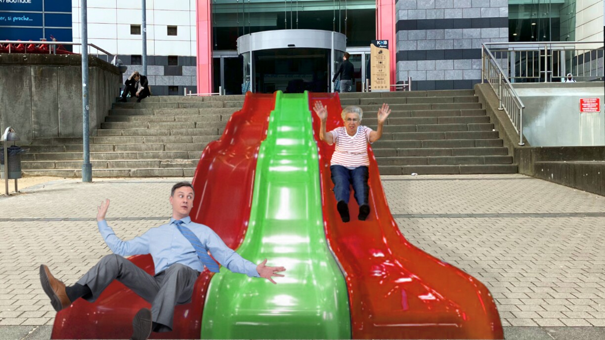 “If we catch you laughing, cheering, or showing so much as a smile, you will be banned from using the slide for a period of six months,” he said. “Not only will we make you go back to using the steps, we’ll make sure you do it while they are icy, you’re carrying a newly purchased 55-inch TV, and you hear the tram going beep-beep-beep as the doors start to close.”