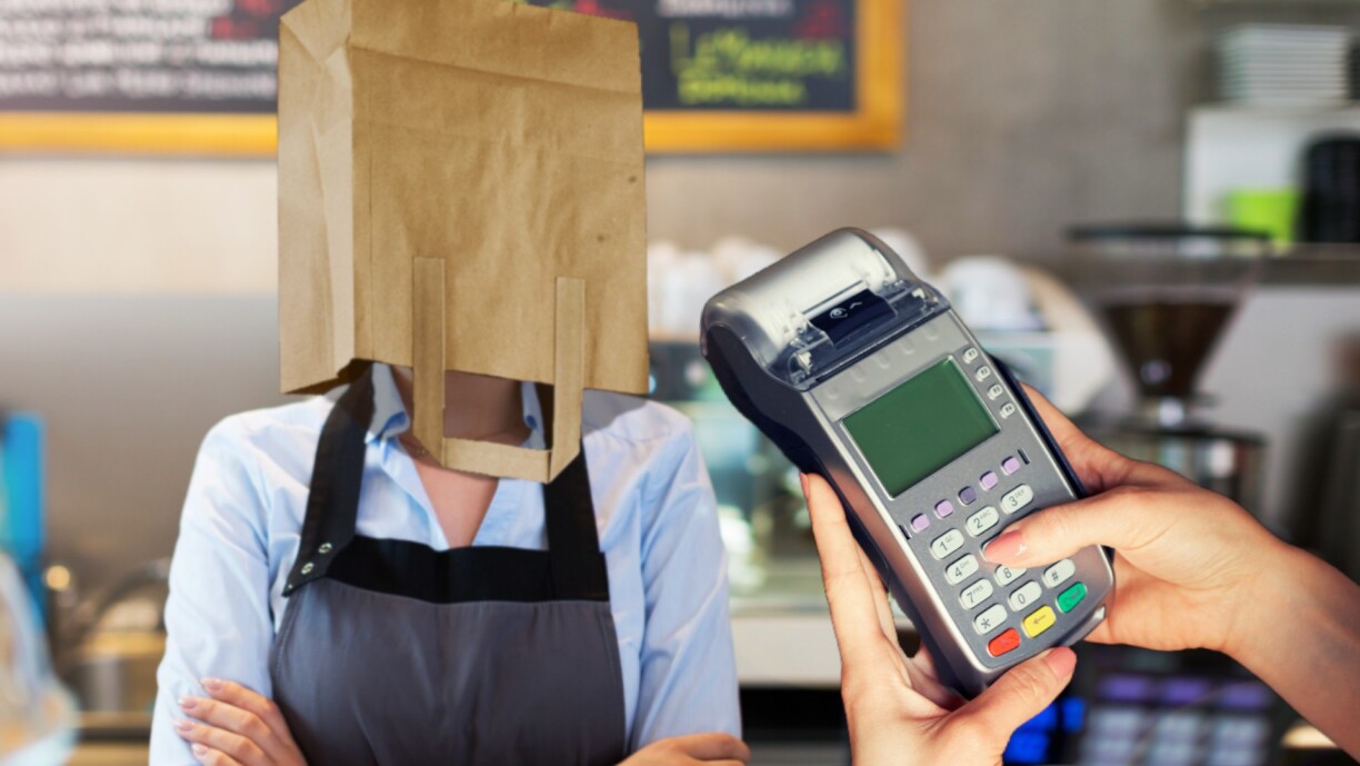 The cashier cancelled and reinitiated the transaction. As before, she turned her head, but this time she also put on a blindfold, which you and your partner found reassuring.