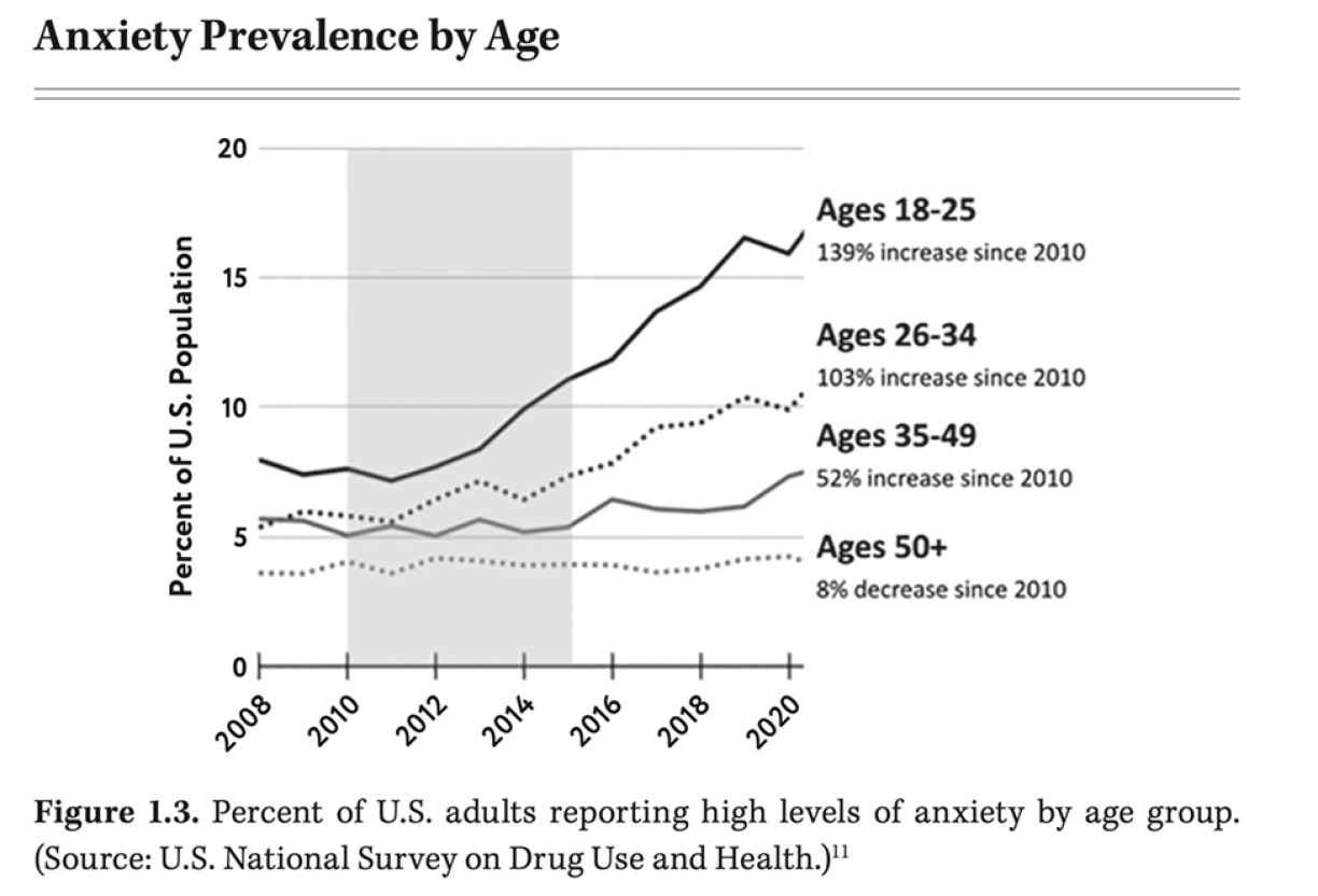 One of the reasons for the increasing number of requests for exam arrangements appears to be growing anxiety among students. In England, there was an 84.5% increase in demand for access arrangements in 2022 compared to previous years (Castiglione, 2021). The rise is linked especially to an increase in generalised anxiety and other mental health conditions. According to Jonathan Haidt (2024), the surge in elevated anxiety levels has continued to escalate over time (see the graph below, taken from his recent book: The Anxious Generation, 2024).
