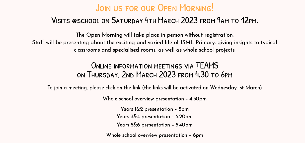 There will be two parts to the Primary Open Day. The first, an Online Information Evening on Thursday, 2nd March, and the second, an Open-Door morning on Saturday, 4th March.