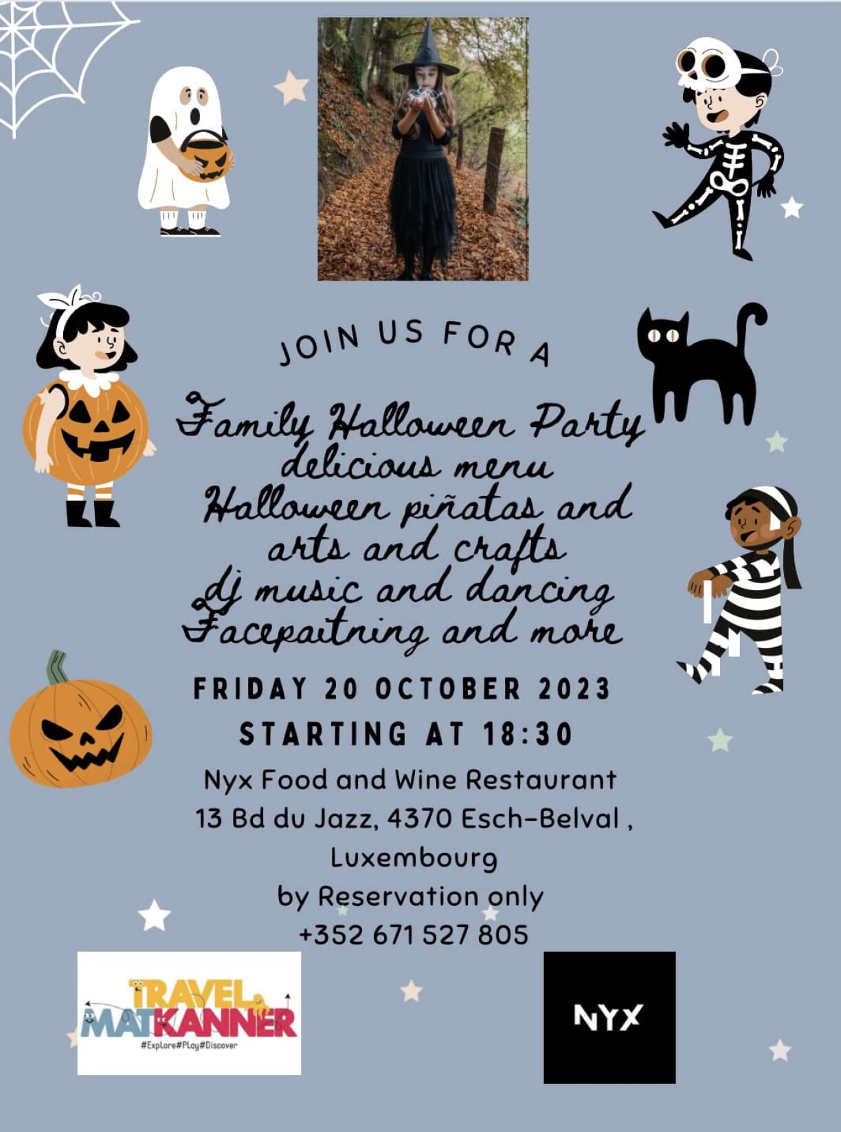 Event Details: Join us for a spooktacular Halloween Party for Families on Friday, 20 October 2023, at Nyx Wine and Food Experience. The festivities kick off at 18:30. Be ready for a thrilling evening with Halloween animation for children by Pinata Factory, arts and crafts, glow-in-the-dark water tattoos, face painting, and a disco featuring a professional DJ. Don’t miss the delicious menu prepared by Nyx’s talented chef and team. Book your spot now; it’s going to be fang-tastic!Facebook Event