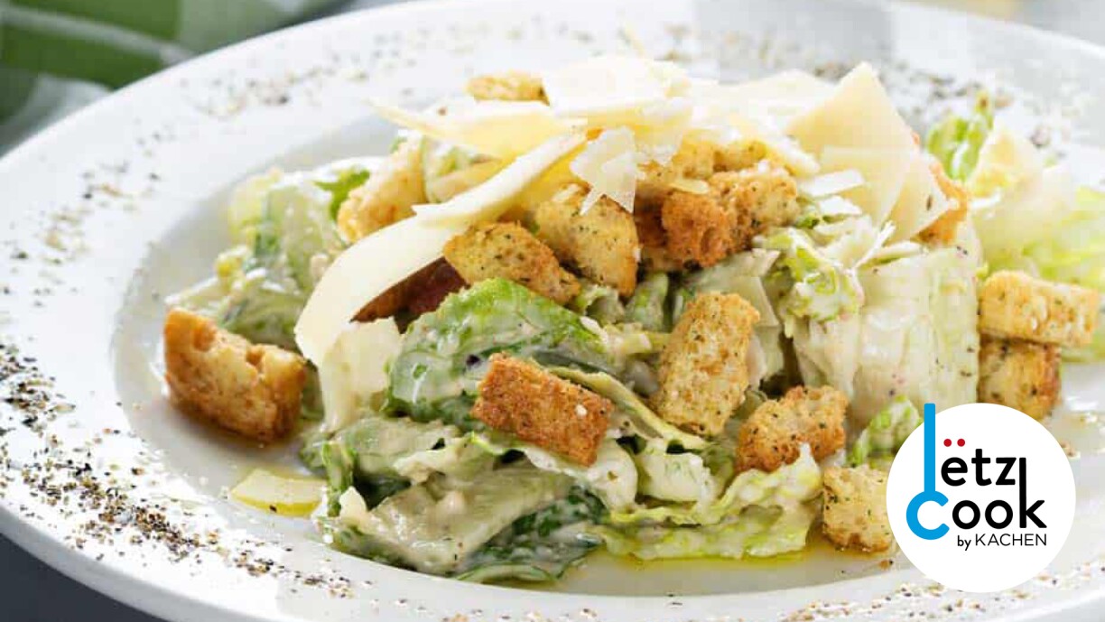 3. Divide salad among the plates. Drizzle with Caesar sauce. Decorate with rosettes of Tête de Moine AOP.