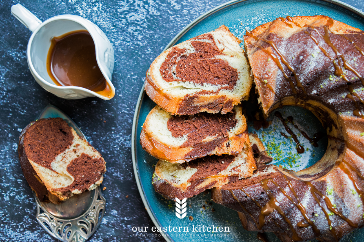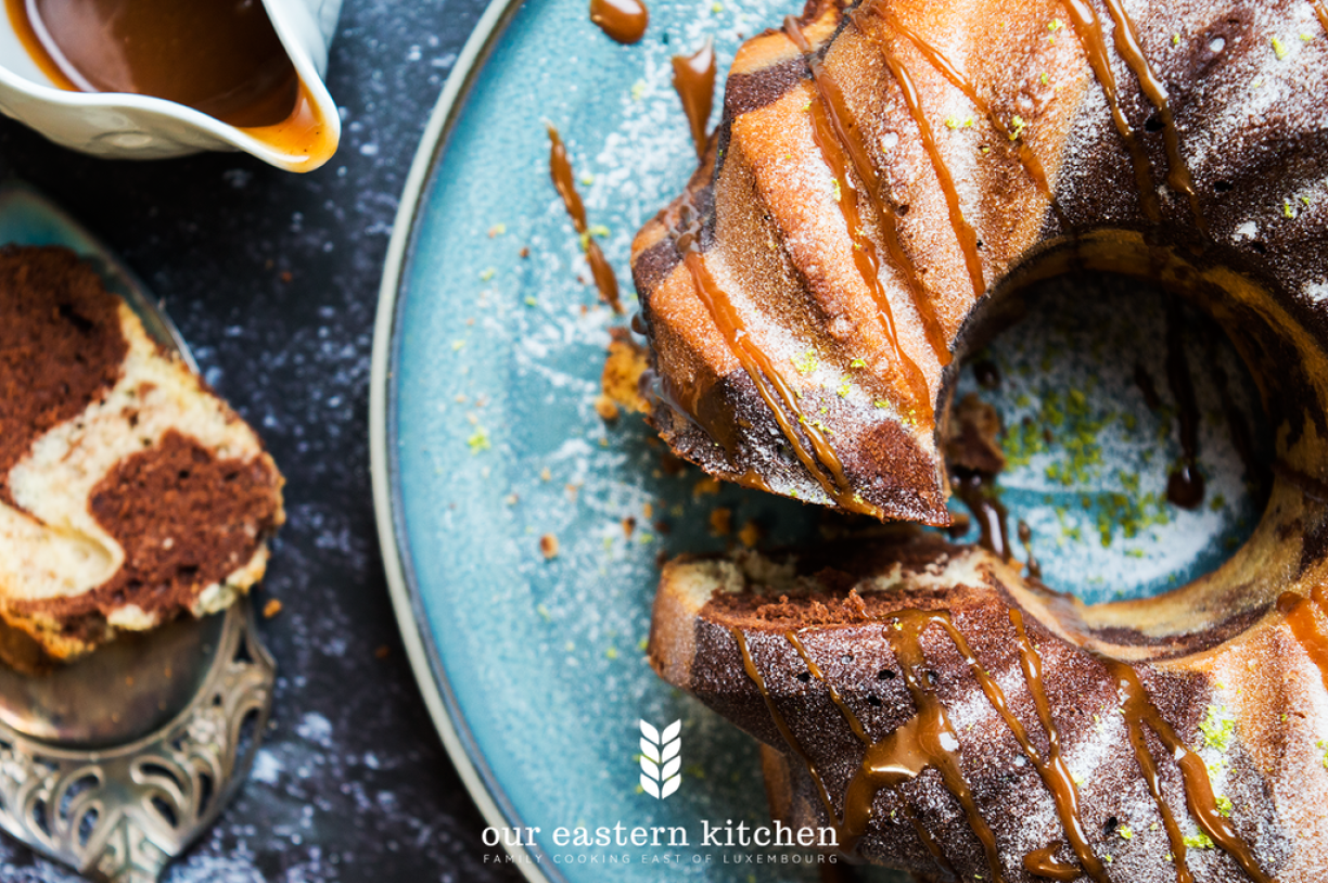 Grease the form with oil and get the oven hot to about 180ºC. Pour both flavours of batter into the form in patches alternating the flavours. After you have finished, take something thin and long, such as a chopstick or a kitting needle, and gently drag it around the form. Do not mix the batters, just stir them a little for a nice marble effect.