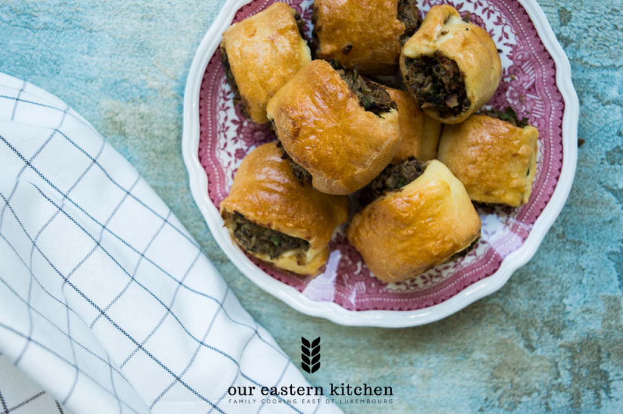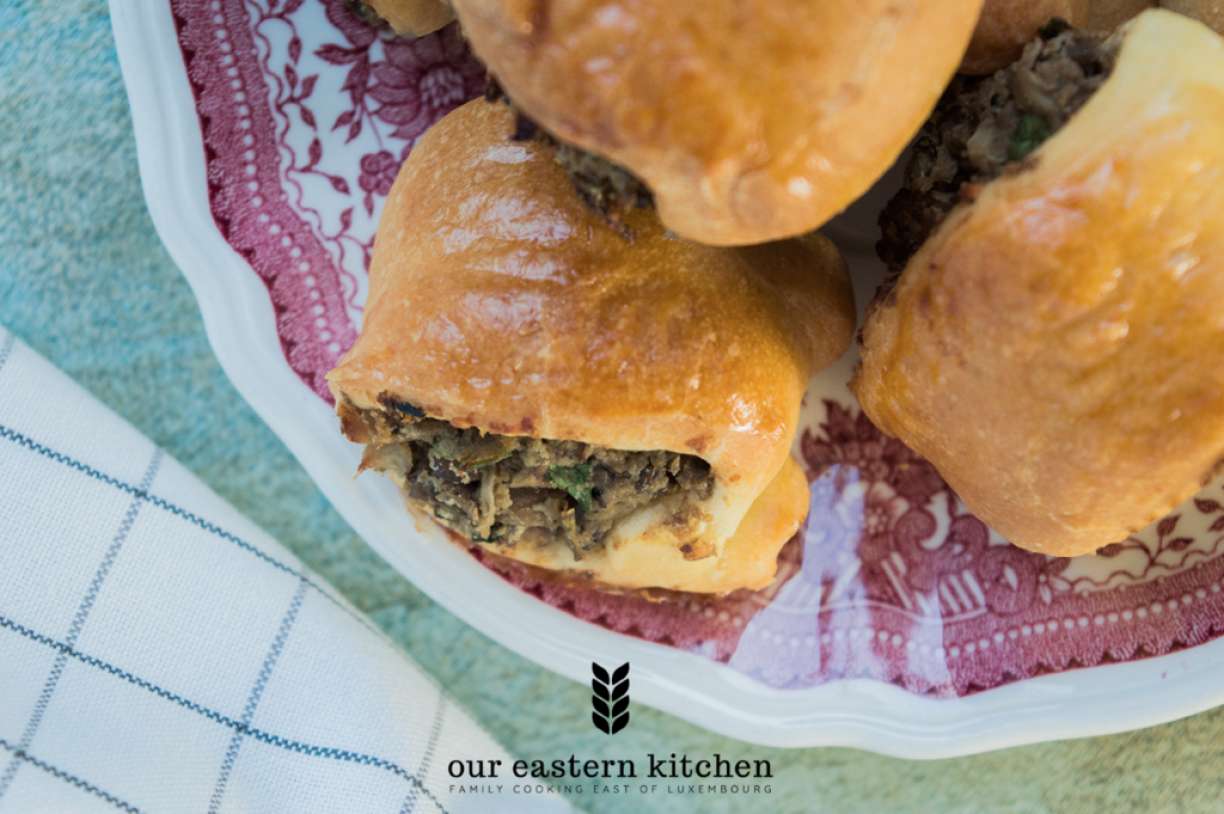 On a parchment paper, gently place all the pasties you can fit. Put them upright, rather than on their side, you need to brown them from the top. Let them proof one more time for about half an hour, then brush them with egg wash (I like making it with a dash of milk) and bake in 180ºC for about 30 minutes, until they are beautifully golden and slightly crispy.