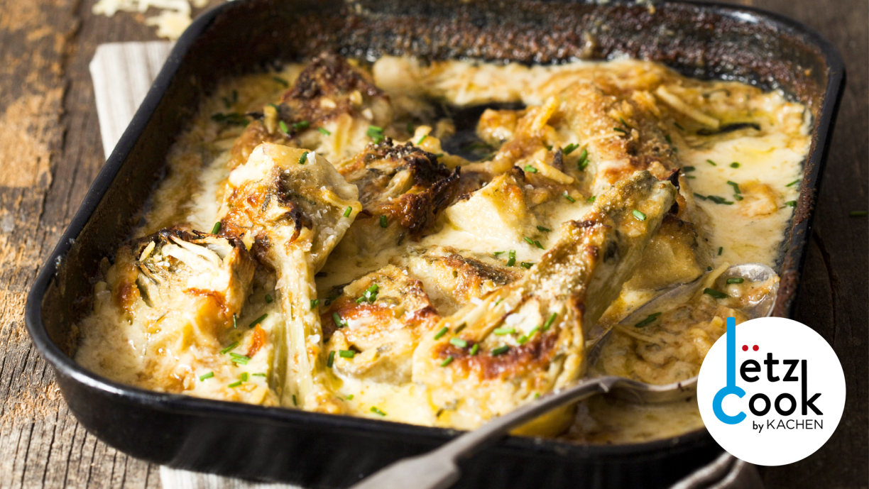 3. Lightly stir the chives and garlic into the cream and pour over the fennel.