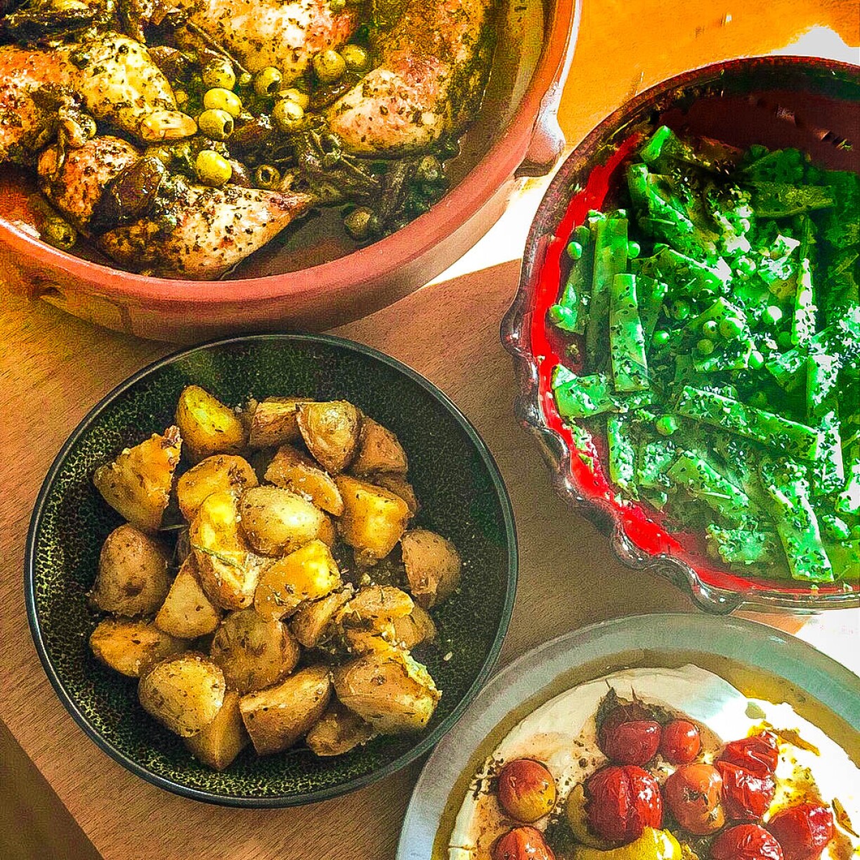 Harissa and confit garlic roast potatoes / Hot Charred cherry tomatoes with cold yoghurt / Two bean and two lime salad