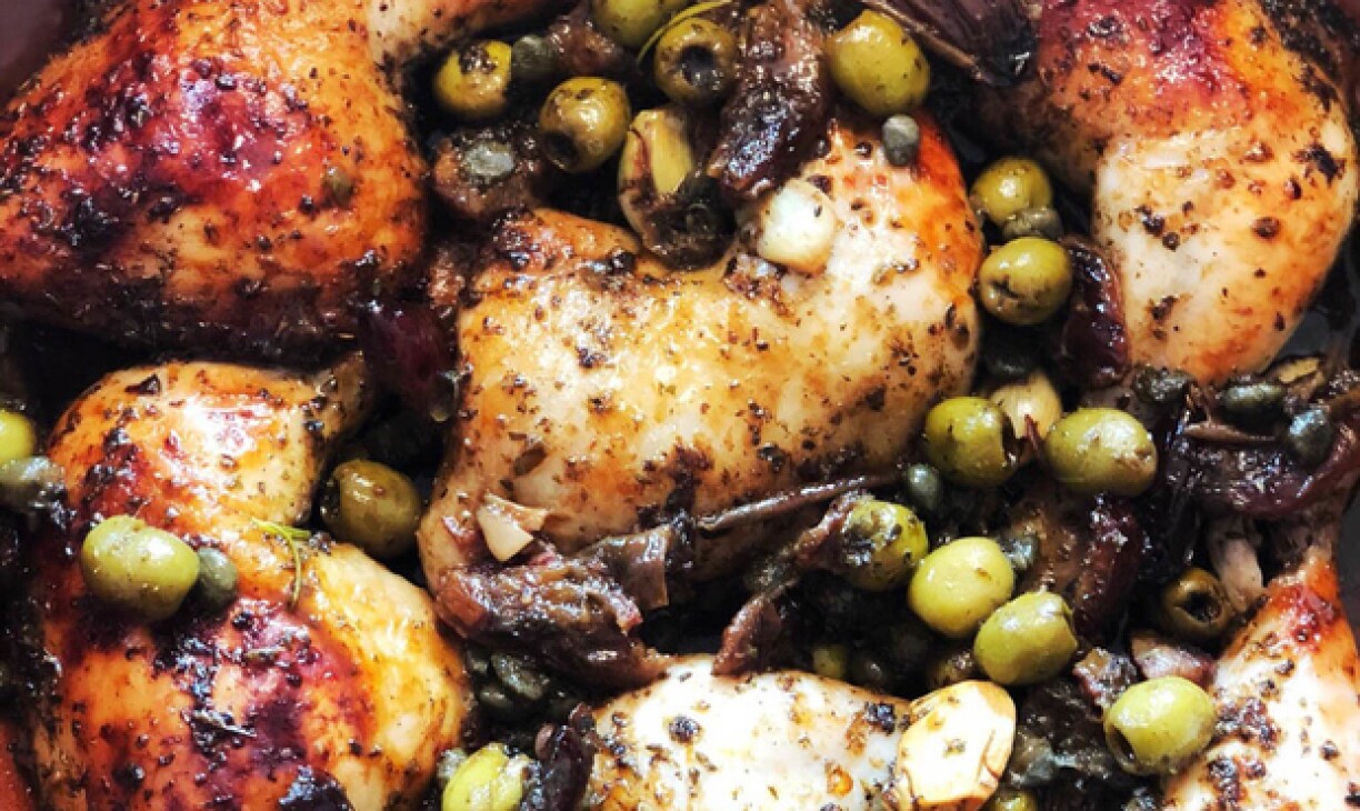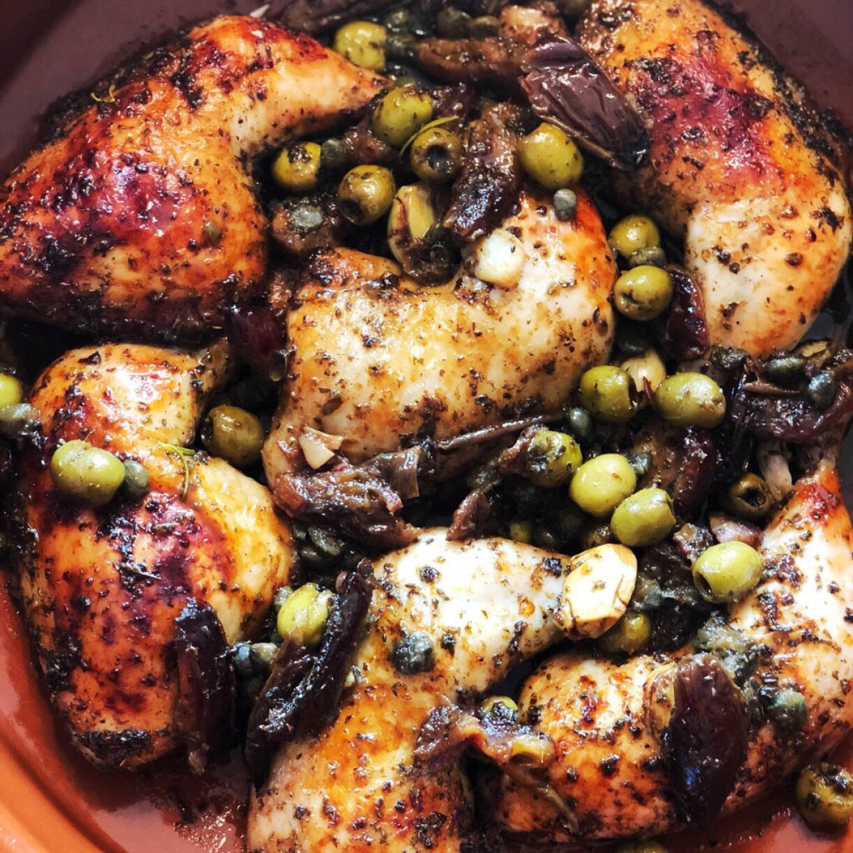 Place the chicken in a large, non-reactive bowl and add all the remaining ingredients, apart from the wine and date molasses, along with 1 teaspoon of salt and a good grind of black pepper.