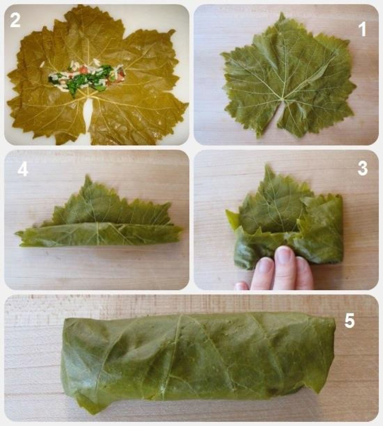 To fill a vine leaf, fold the lower third of the leaf over the stuffing, fold the right side of the leaf over then the left side, and then roll up to enclose filling.