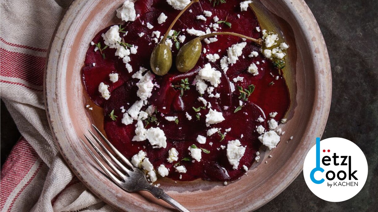 Allow to cool, peel and cut into very fine slices with a sharp knife or mandolin. Arrange overlapping on a plate like a carpaccio. Season with salt and pepper, add some mild vinegar and the nut oil, sprinkle with the goat cheese. Finish with some fresh Rosemary and olives.