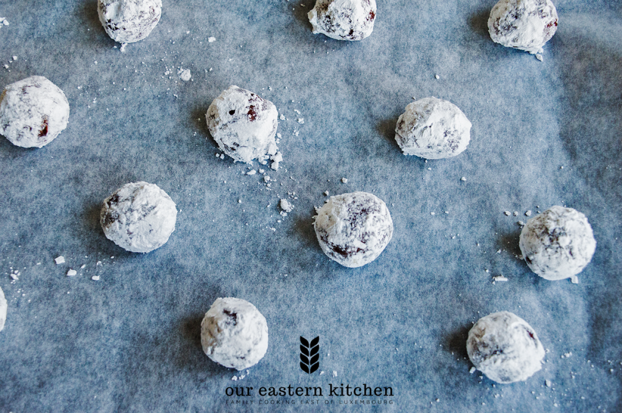 After few hours (or a night), prepare the oven to baking (165ºC, line the tray with baking paper) and use a tablespoon to portion the dough. I use a measuring tablespoon, it has sharper edges and makes the process easier. From each portion make a small ball, roll it in icing sugar evenly and place on the tray to bake. No need to keep spaces too big, the cookies will get larger, but will keep their shape.