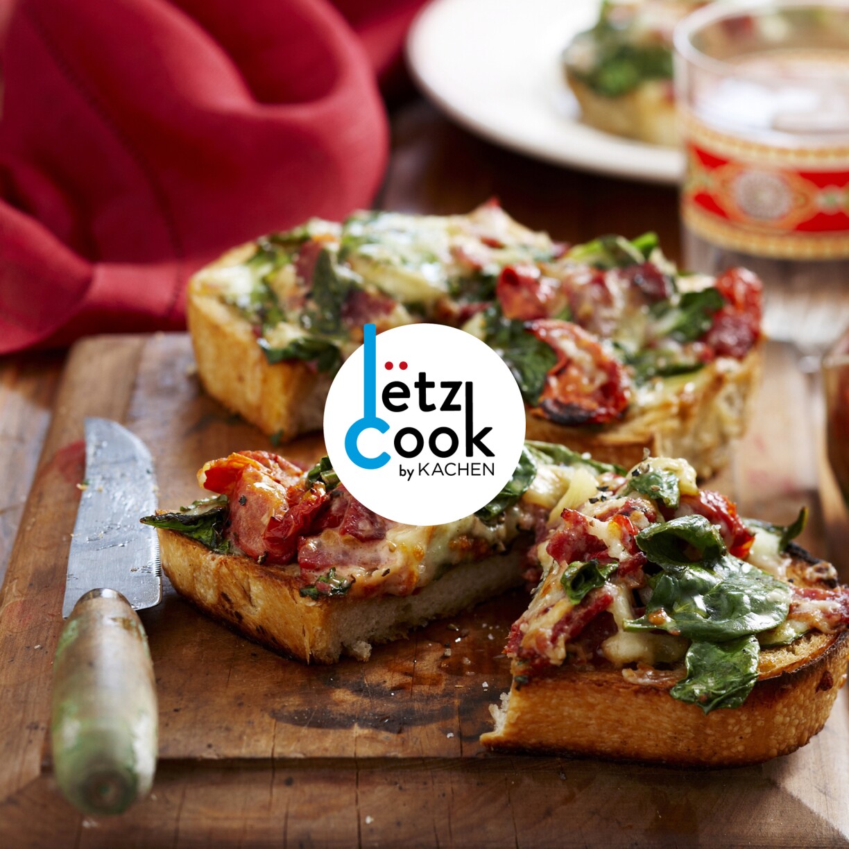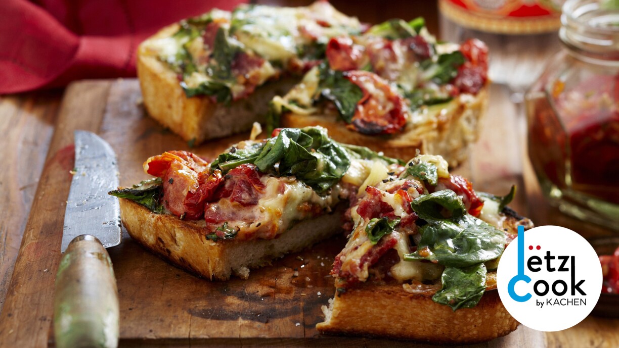 In a large bowl combine spinach, salami, tomato, cheese and mayonnaise. Season to taste. Pile evenly on toast. Grill 2 - 3 minutes, until cheese is melted.