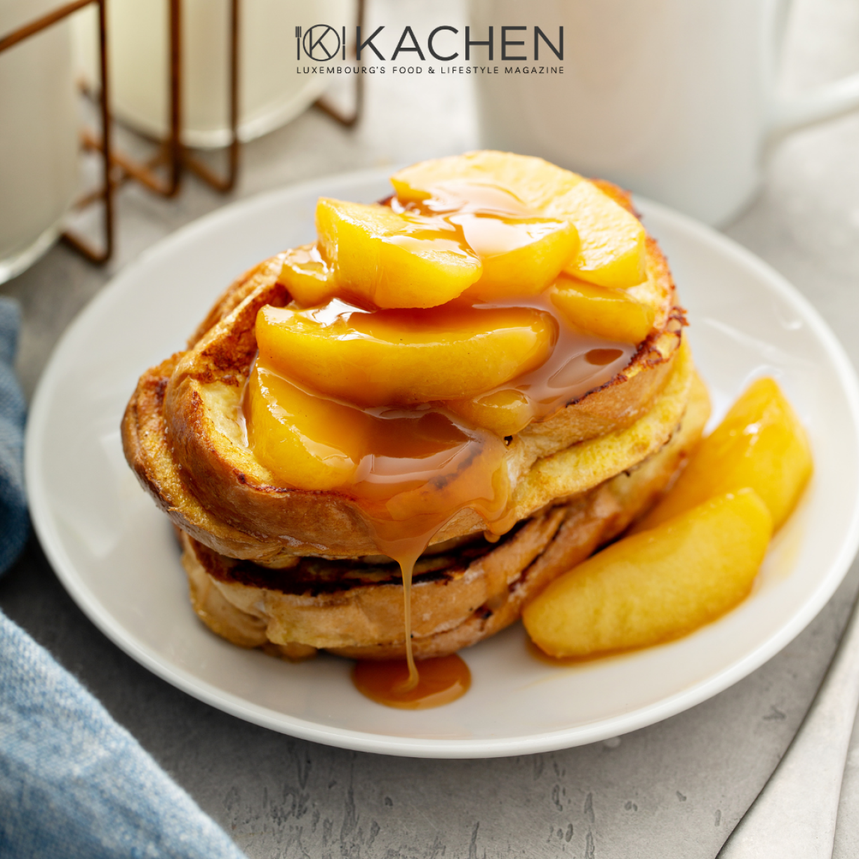 Serve the French toast with caramelised apple slices, a dollop of crème fraiche, maple syrup and slivered almonds.