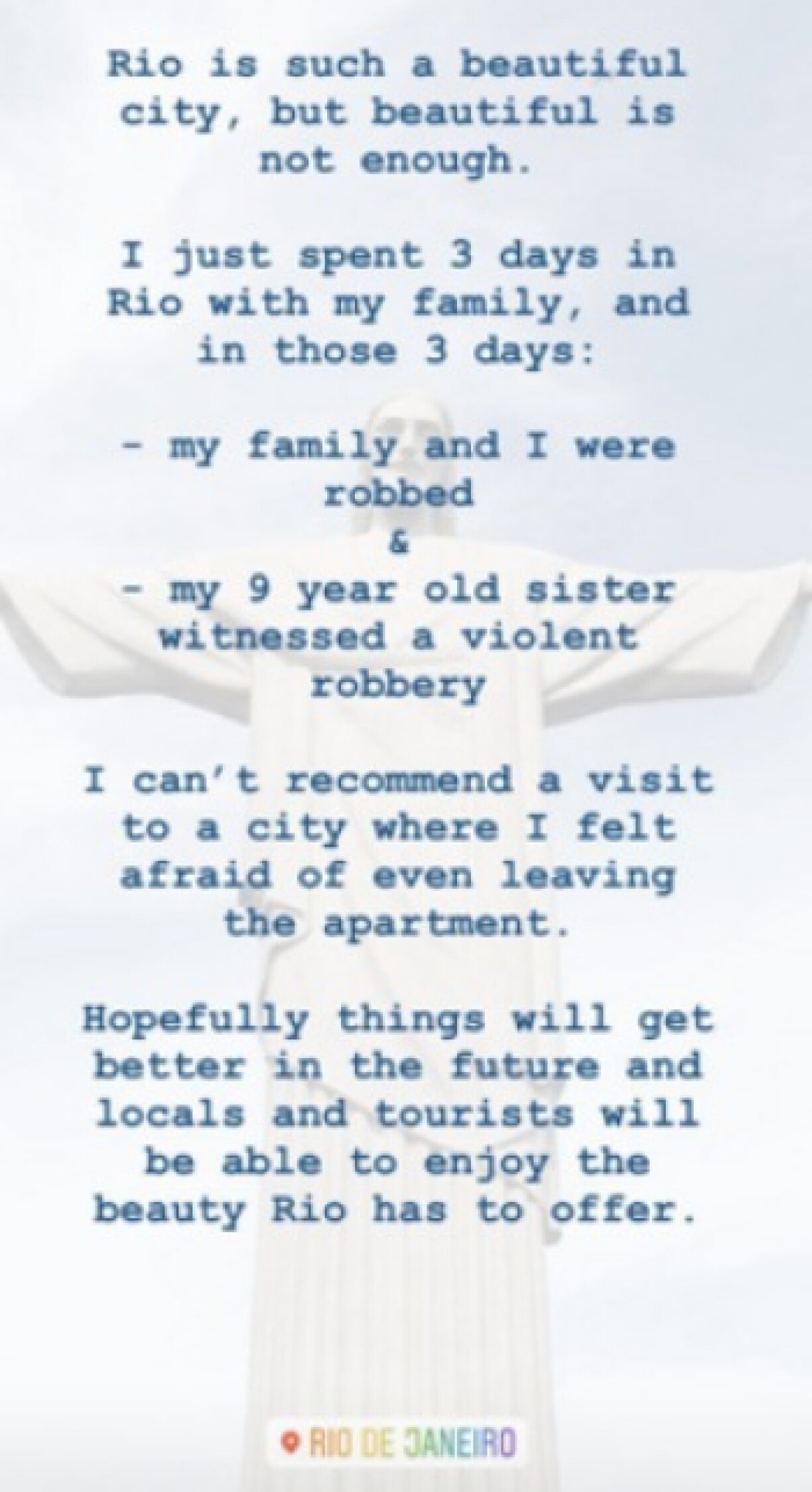 During a three-day stay in Rio, @withlai wrote, “my family and I were robbed and my nine-year-old sister witnessed a violent robbery. I can’t recommend a visit to a city where I felt afraid of even leaving the apartment.”