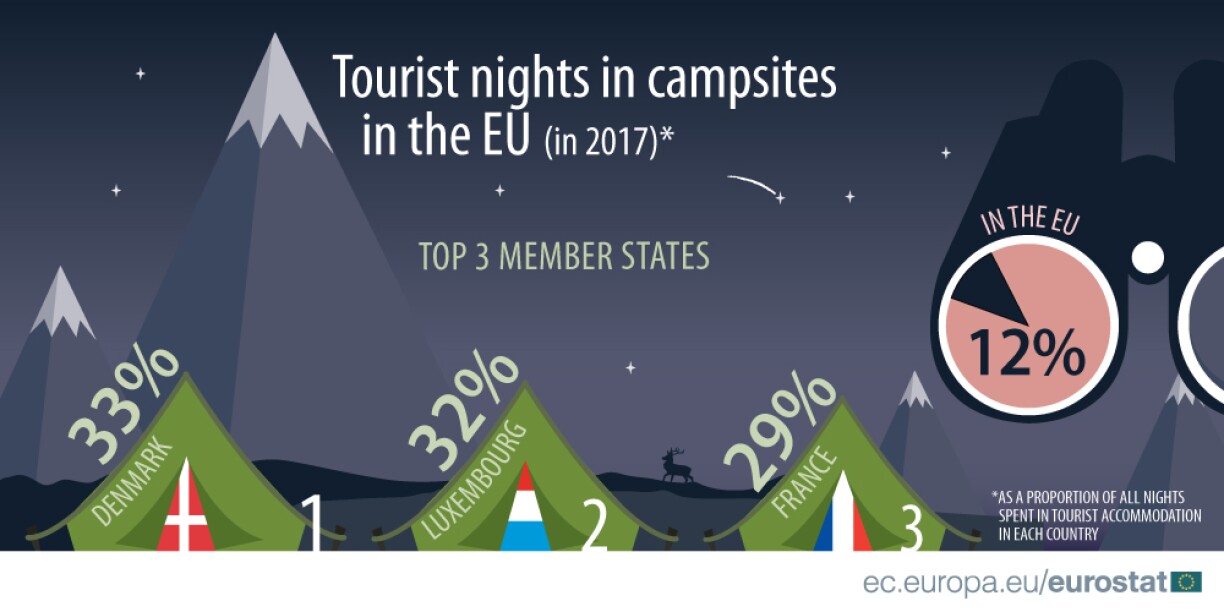 The overall leaders, in terms of the share of nights spent camping in the EU, are France (a whopping 31%), Italy (14%), and the UK (13%). It would be rather hard for Luxembourg to compete in this category.. To put things into perspective, a total of 557,029,635 tourists nights were spent in France in 2017, compared to just 3,830,847 in Luxembourg.