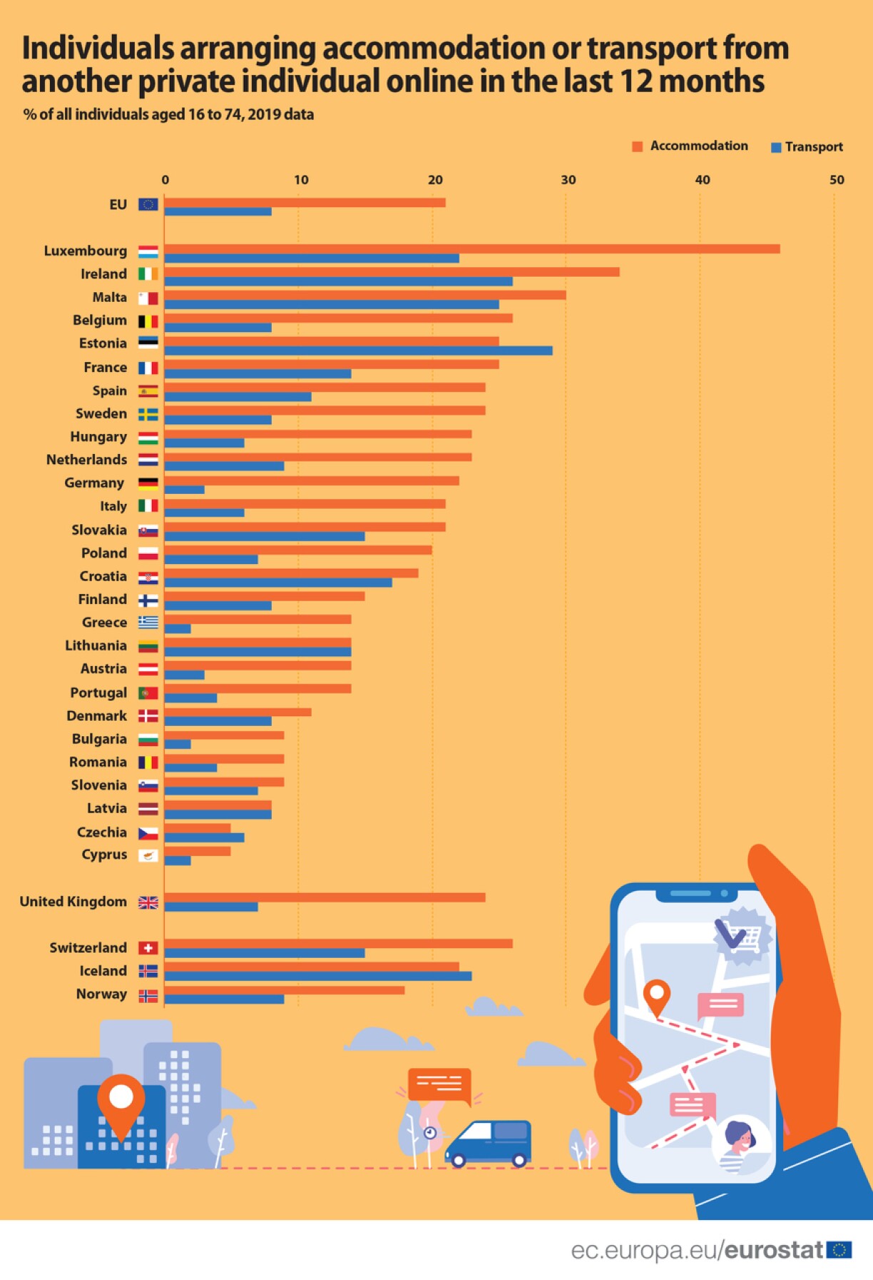 Luxembourg was already in the lead last year when it comes to using collaborative platforms (your AirBnB etc.), and remained in the top spot for 2019.