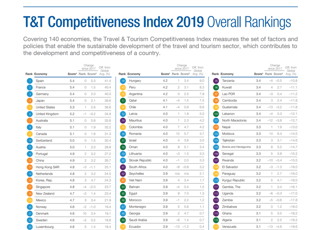 Published every two years, the report presents the travel and tourism competitiveness of 140 countries and measures the factors that enable the sustainable development of both travel and tourism, in turn contributing to the development of a country. On 4 September, the World Economic Forum published its 2019 report.