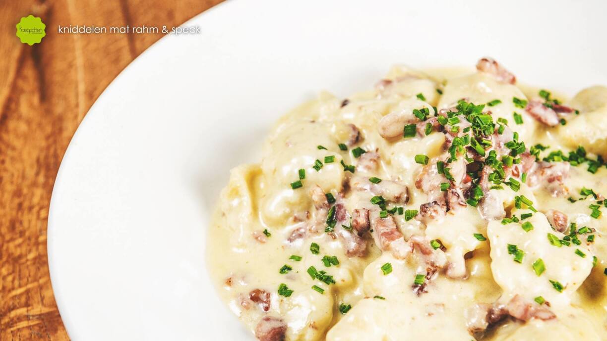 And then there are the endless variations: fried with or without bacon, served with cream sauce or applesauce – or both. Nowadays, it’s not uncommon to see Kniddelen paired with tomato sauce, prawns, or even a mustard-wine reduction. When it comes to these floury dumplings, there are no limits to creativity – or madness in some people’s opinion.