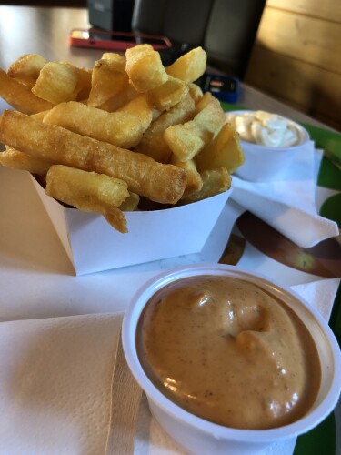 First bite, and it’s delicious. They serve thick-cut, double fried, Belgian frites with a great fluffy to crunchy ratio. The sauces were served with the classic La William sauces, adding to the level of deliciousness and even familiarity.