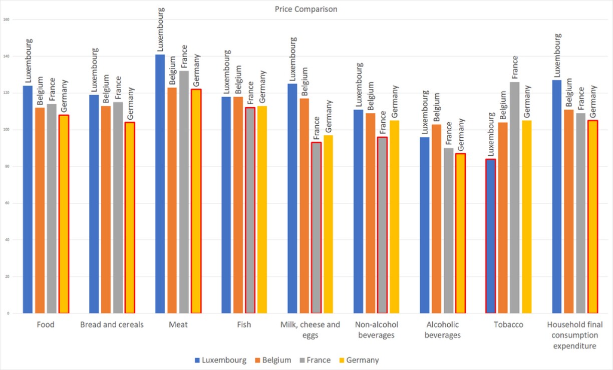Food - cheapest in Germany, and most expensive in Luxembourg.