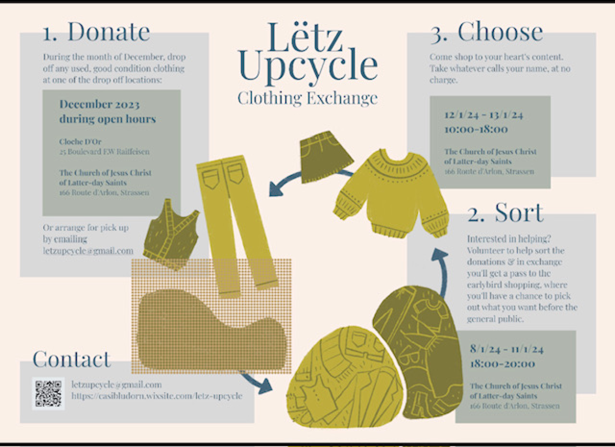 Organiser Casi reached out to us about the Lëtz Upcycle Clothing Exchange taking place this weekend in Strassen. Over the month of December, generous amounts of clothes were donated to the organisation. Volunteers then sort them and give them away for free at the Clothing Exchange weekend. Take whatever calls your name, at no charge, at the The Church of Jesus Christ of Latter-day Saints. They’re always looking for more donations and volunteers (who get early access before it opens to the general public). Let’s go, sustainable clothes shopping!